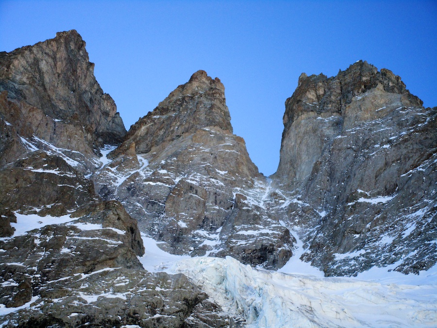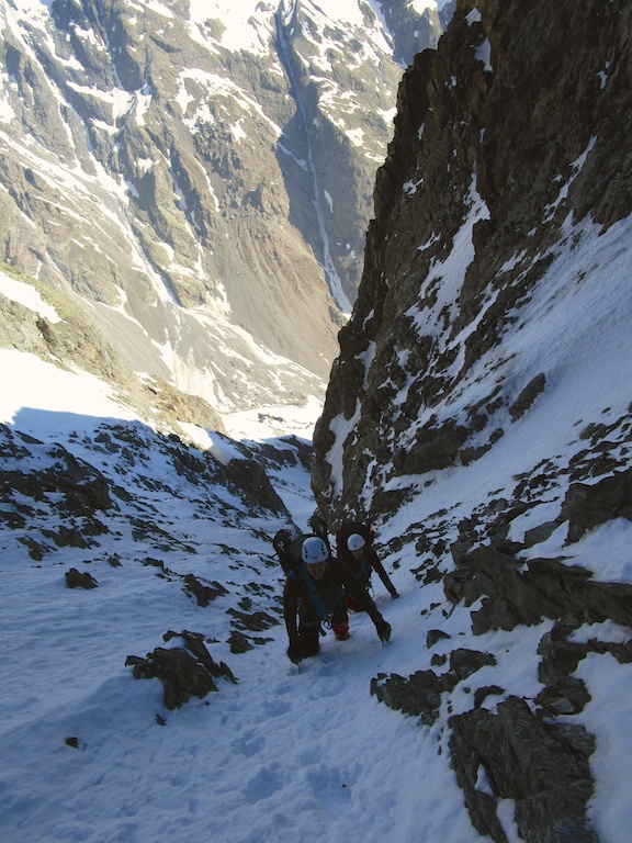 Et enfin de franches rigolades. Clin d’œil à Laurent qui nous a tellement fait rire à notre arrivée. A la recherche d’un itinéraire bis, déroutés par le mauvais état du couloir (du Coup de Sabre) que nous projetions de gravir, Laurent nous propose le Col Est du Pelvoux. La carte nous rend perplexes quant à son appellation car non seulement celui-ci est orienté nord mais en plus il débouche à l’ouest du Pelvoux. Questionnant Laurent sur le sujet, celui-ci nous répond, quelque peu évasif et affairé : « Certains l’appellent le couloir Nord. Mais nous on l’appelle le col Est ». Avant de se retirer gaillardement en cuisine. Simplicité je disais…