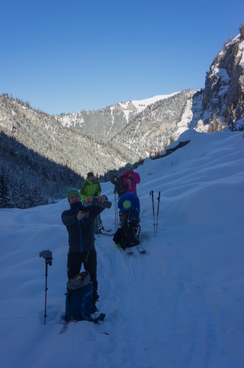 Nous sommes partis avec un groupe international et hétérogène, aussi nombreux qu’à une collective du CAS !!! Les sourires observés en disaient long sur la joie partagée d’enchaîner quelques virages dans la poudreuse.