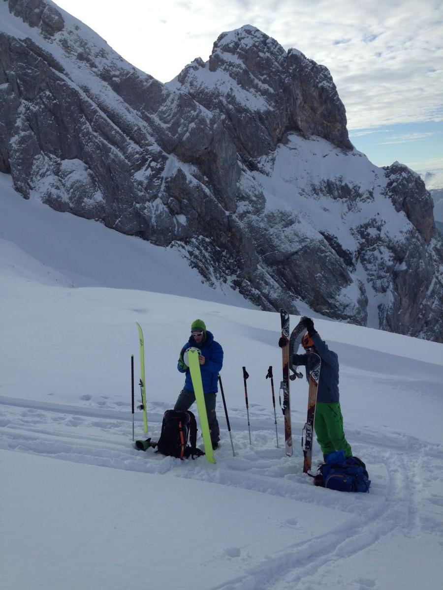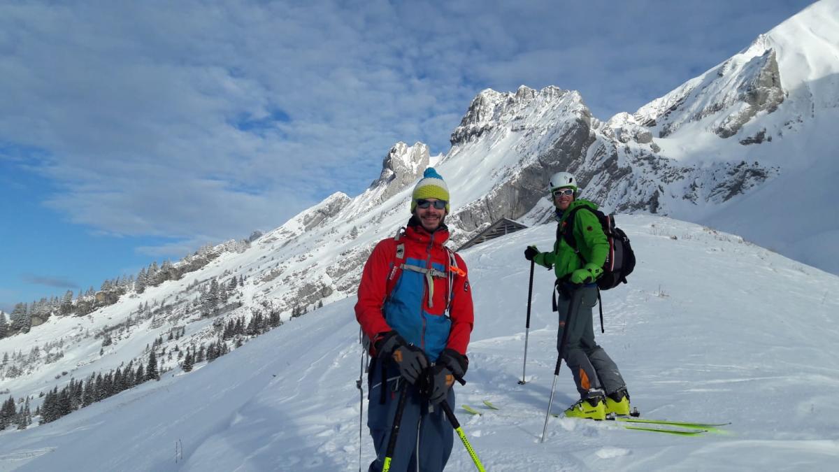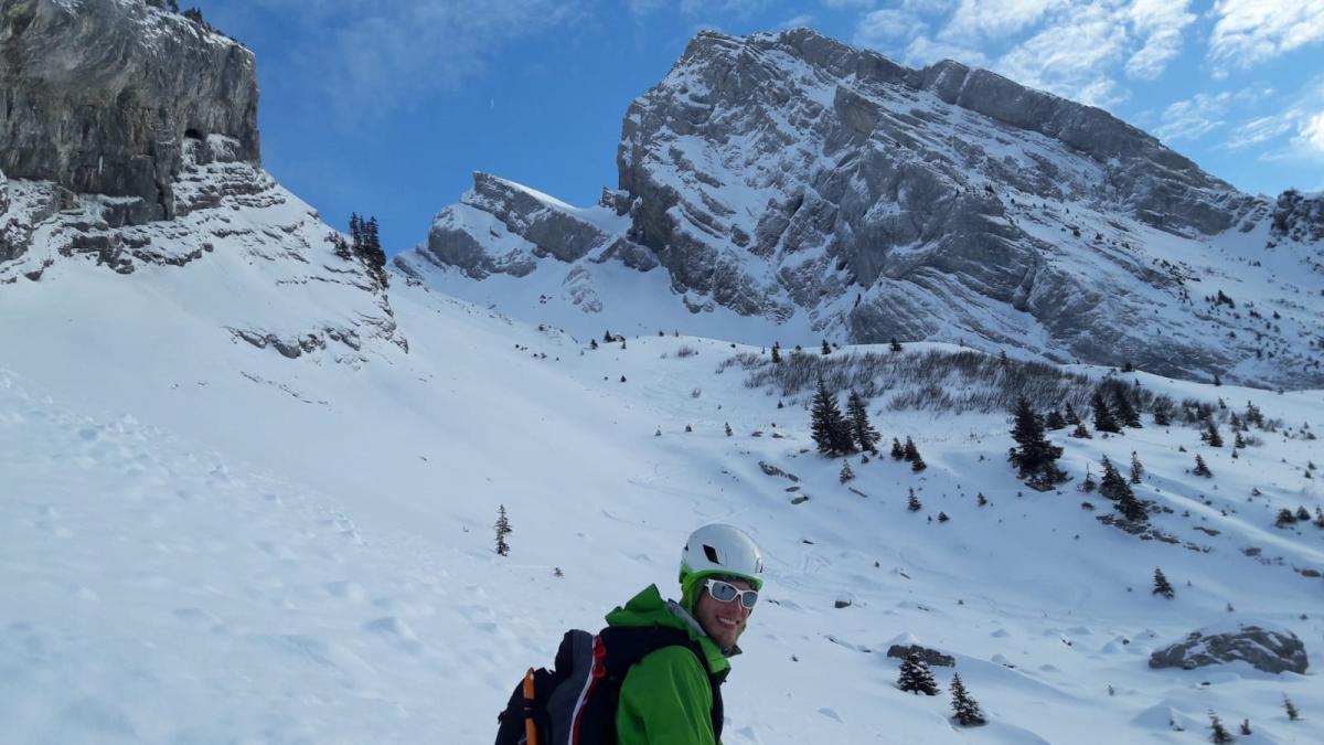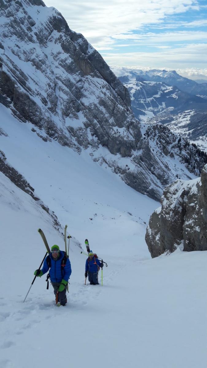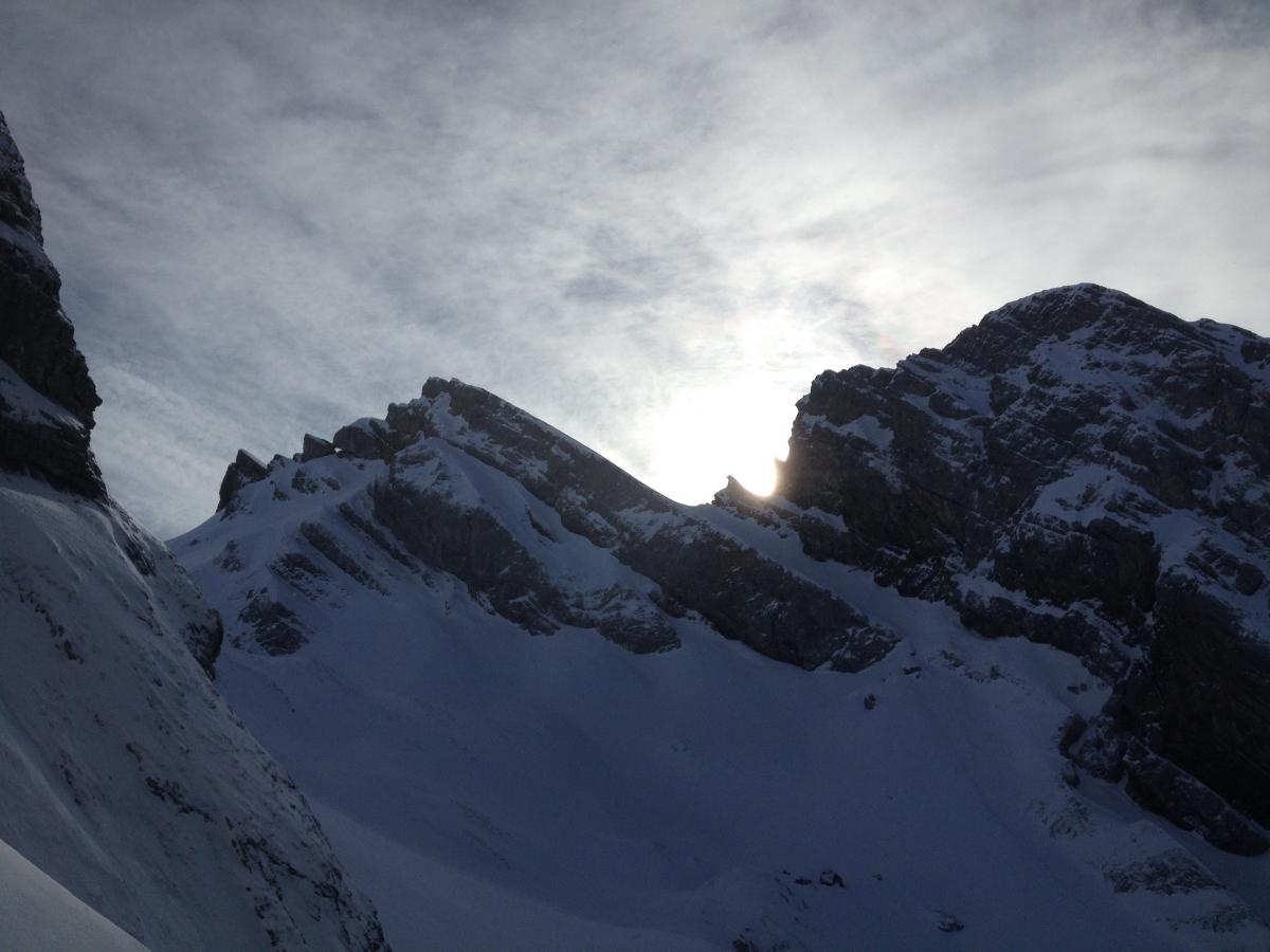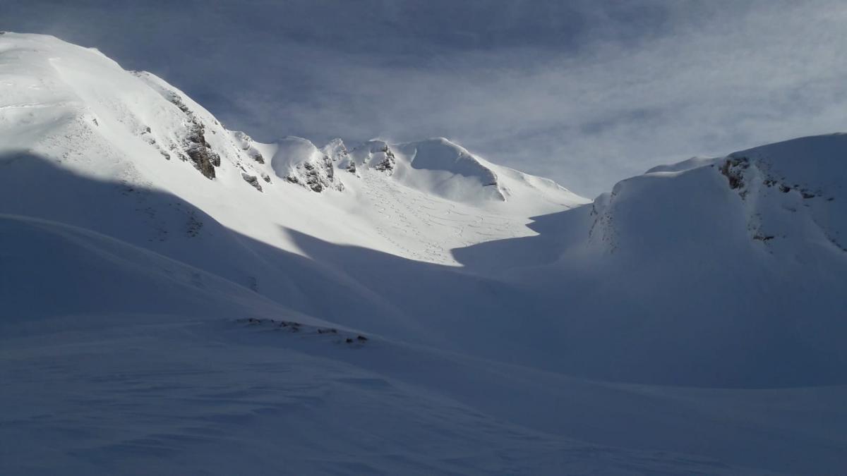 Sommet du couloir de la Salla. Nous cassons la croûte. Nous nous retrouvons ici au hasard des conditions de neige du jour. Le vent qui a accompagné les dernières chutes a créé une mosaïque où il a fallu naviguer à vue pour optimiser le plaisir de la descente en poudreuse. Sommet du petit couloir de la Salla donc et là un choucard nous fait grâce d’une parade délicieuse. Dessinant des sinusoïdes presques parfaites il déploie ses ailes à chaque ascension et plonge bec en avant ailes repliées à chaque chute. Le spectacle est saisissant de perfection et de simplicité. Un peu comme cette journée là haut. Merci à Stéphane et Phil pour cette envolée.