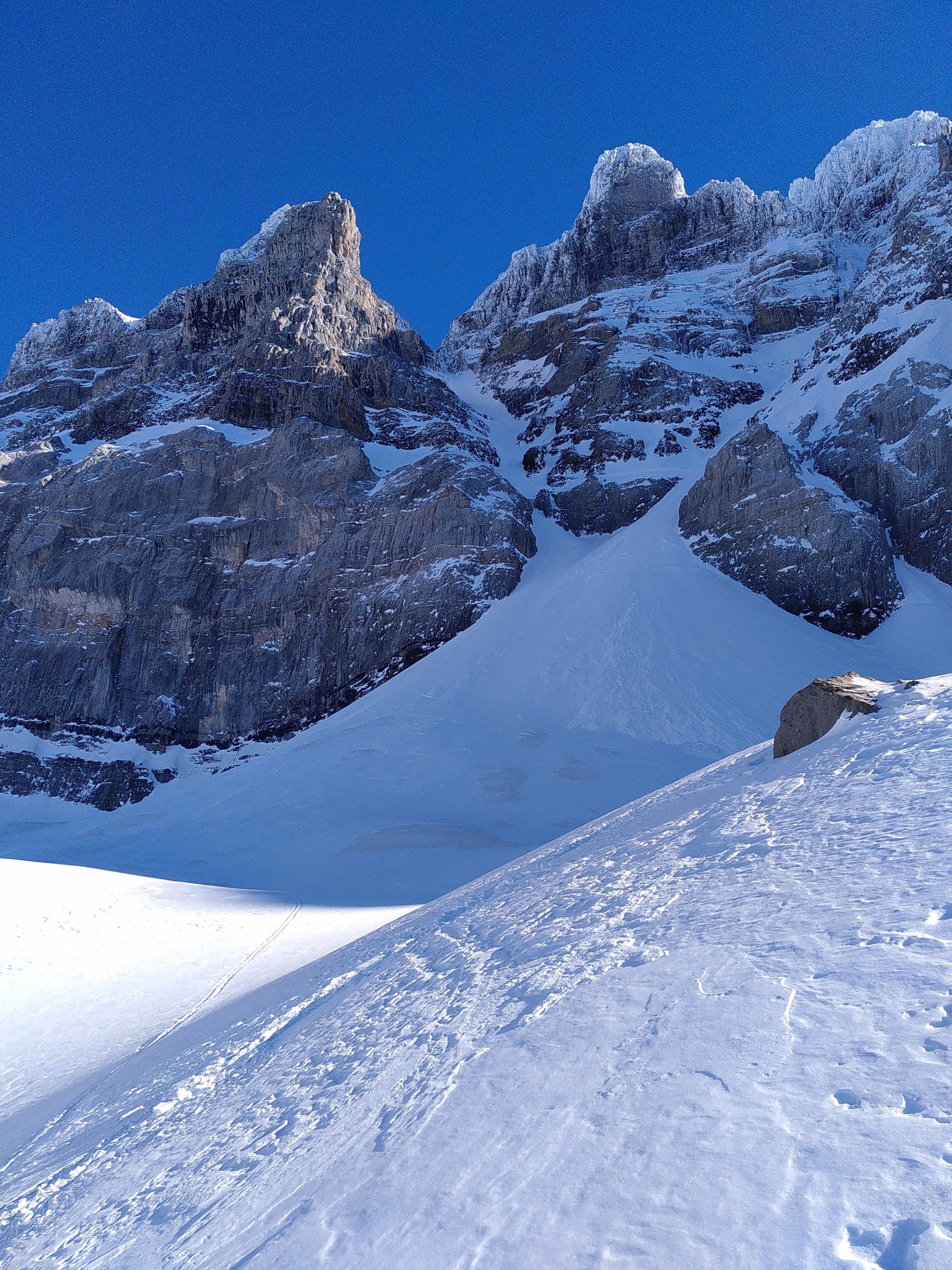 Certaines lignes ont un effet d’attraction presque irrépressible. Dans le cas de ce couloir NW du col de la Dent Jaune, l’aspect imposant des Dents du Midi et l’évidence de la ligne de neige jouent tous deux un rôle dans l’appel. Difficile d’imaginer que je n’ait jamais foulé le pied là-haut ni même une spatule. C’est la semaine précédente, du sommet de la Pointe de Bellevue que l’évidence d’une visite s’est imposée.