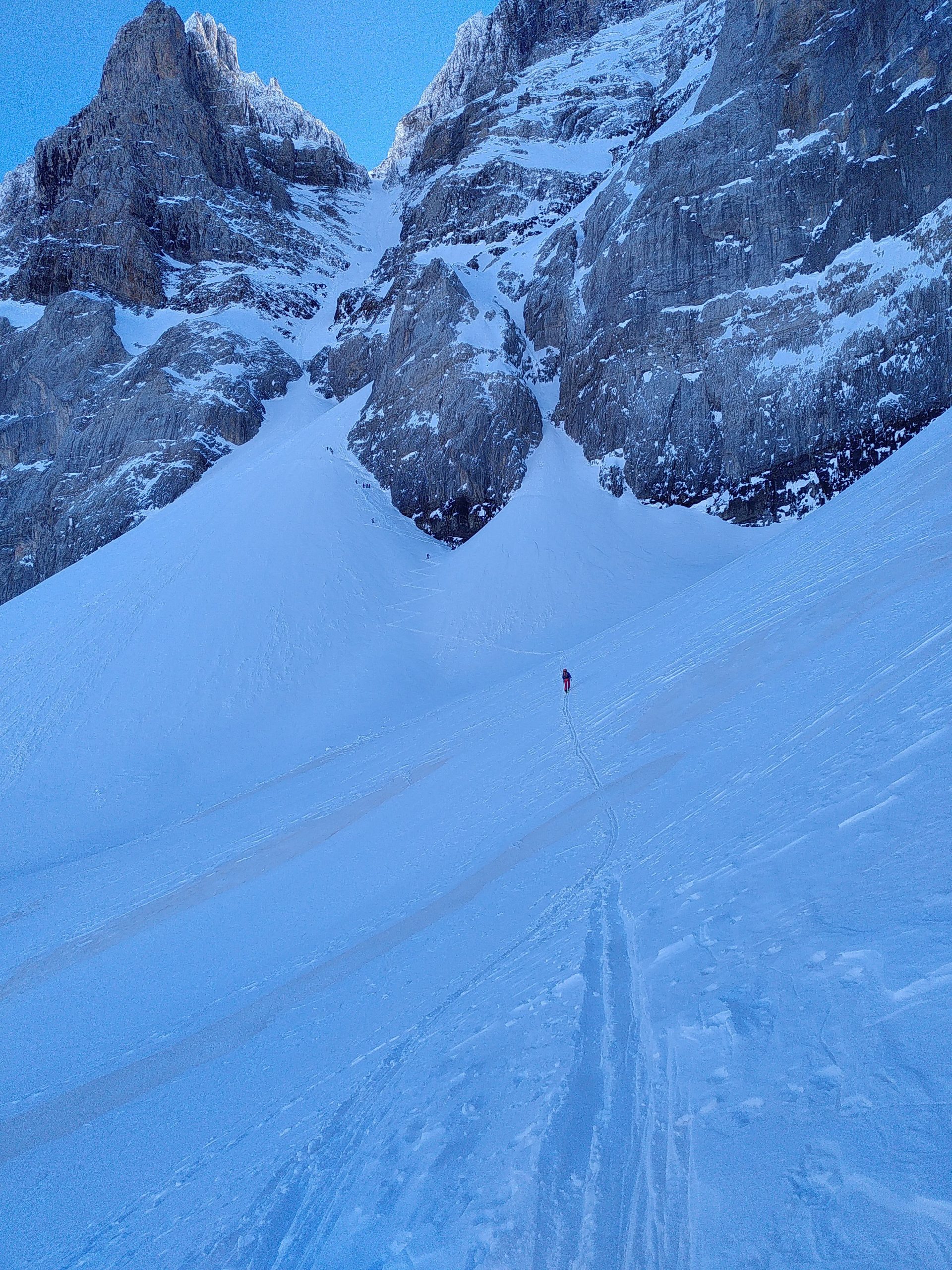 Les foulées skis au pied et les conversions s’enchaînent avant de pouvoir remettre les skis sur le dos pour la remontée du couloir à proprement parler. Un étranglement au bas de celui-ci nous oblige à un détour par la droite avant de poursuivre l’ascension. Nous connaissons bien ces sensations, concentrés pour ne pas faire la moindre erreur, fatigués par les efforts déjà consentis, hébétés par la répétition des efforts, fascinés par la splendeur des lieux encadrés par des murailles de pierres givrées, attentifs aux aléas du terrain que nous redescendrons sous peu.