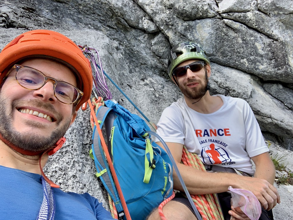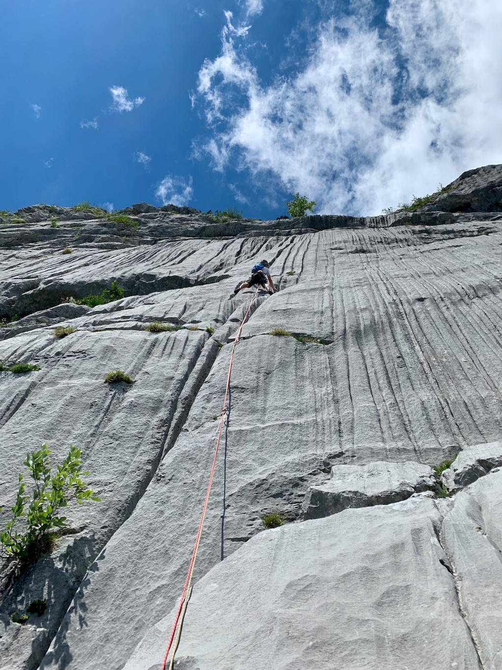 Côté grimpe chaque sortie se révèle bien différente. Début mai avec Tim nous tentons l’Opium du peuple à la Pointe de Dran. Nous ferons deux longueurs bien dures avant de nous rendre compte que nous étions dans une voie inconnue à droite de notre projet. Rappels vers le bas donc et pause sandwich, au pied des voies, plus longue que prévue. Le 24 mai avec Béatrice (en novembre nous avions déjà grimpé ensemble quelque mètres à droite dans A capella…) nous optons pour Amadéus, une agréable escalade homogène en 5c juste à côté de la fameuse Woody Wood Pecker dans laquelle nous descendrons en rappel et qui effraiera beaucoup Béatrice, par ses dalles bien lisses et ses canelures tranchantes. Le 12 juillet enfin, direction la Pointe de Dran à nouveau avec Stéphane, pour Woody Wood Pecker. Relativement courte mais probablement l’une des plus belles au Sapey selon moi. Un bon engagement entre les points qui donne une satisfaction non dissimulée à chaque longeur grimpée même si le niveau est de 6a+ max. Je me revois encore visiualisant mon pied gauche dans les canelures ciselées, gagnant centimètres après centimètres, me concentrant sur lui au maximum pour qu’il tienne et que je ne finisse pas en chair à saucisse. Le pied 😉