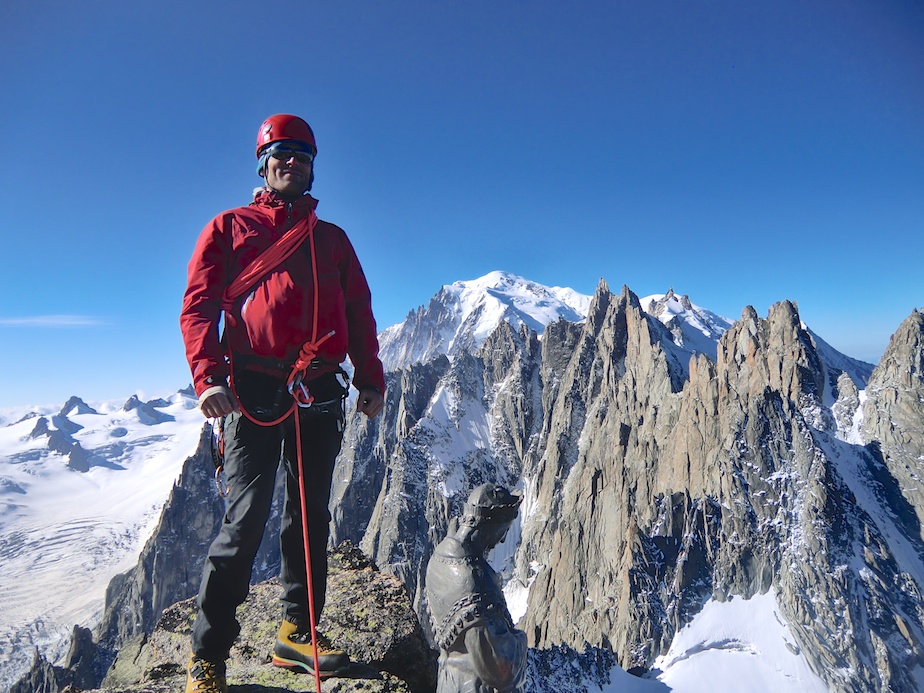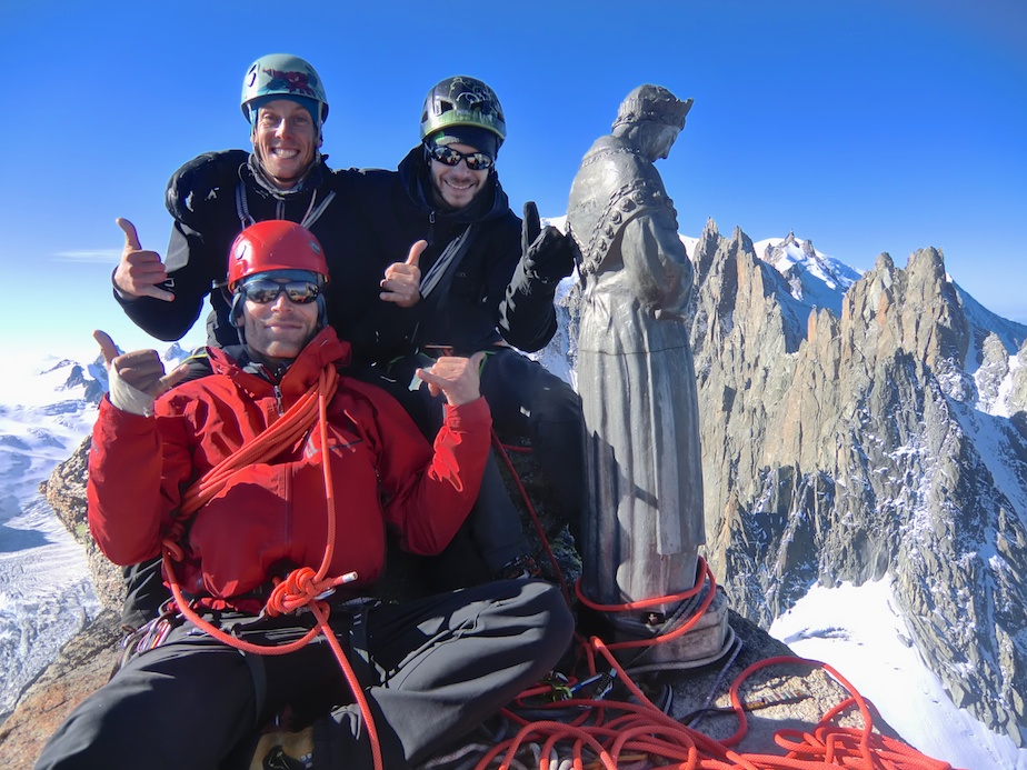 Chaudement installés sur étroite plateforme, nous sommes réveillés par nos alpinistes refroidis qui attaquent la descente aux premiers rayons du jour. De notre côté nous retournons sur nos pas pour espérer fouler le sommet. De retour à la brèche, seule la fissure Knubel nous en sépare encore. Connu des historiens comme le premier passage de V+ à avoir été gravi en montagne, son escalade est réputée ardue. Si bien que le fameux guide Vallot qui répertorie toutes les courses classiques du massif en décrivait chaque mouvement ! Personnellement j’ai trouvé son escalade relativement pêchue, d’autant que nous étions en grosses chaussures de montagne, mais pas si déconcertante que je me l’imaginais de prime abord. Cela restera dans mon esprit comme un grand moment d’escalade d’autant que l’arrivée au sommet, gardé par une vierge protectrice, est tout bonnement spectaculaire.