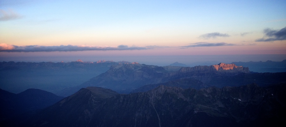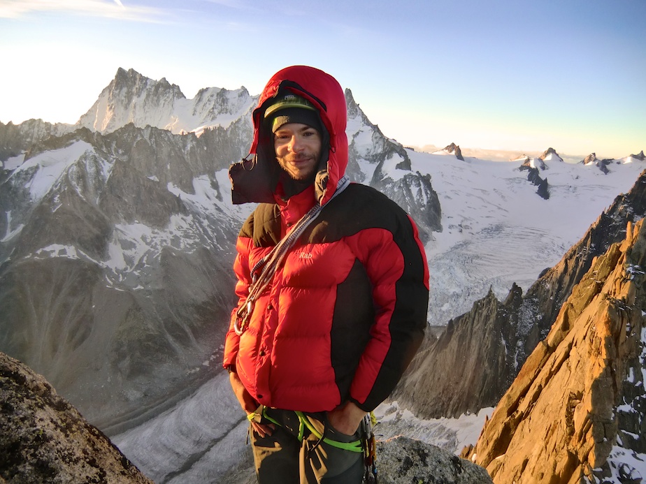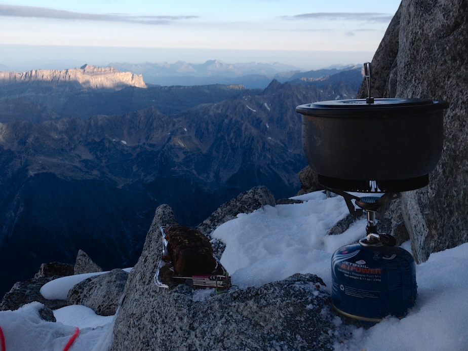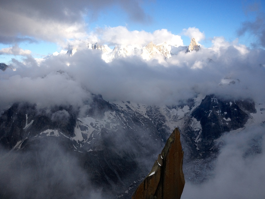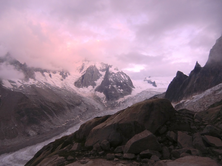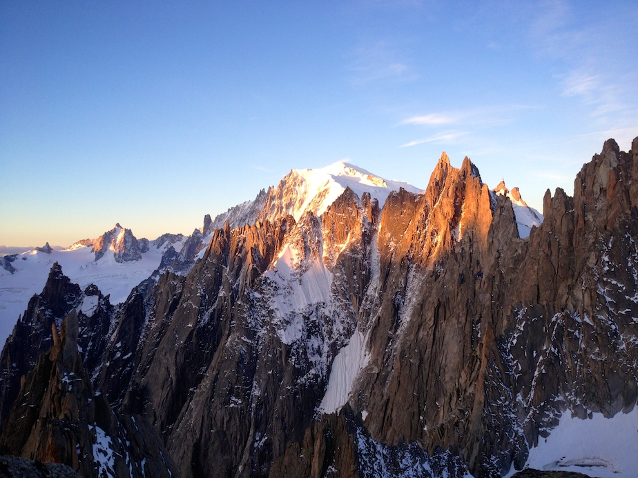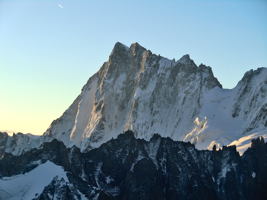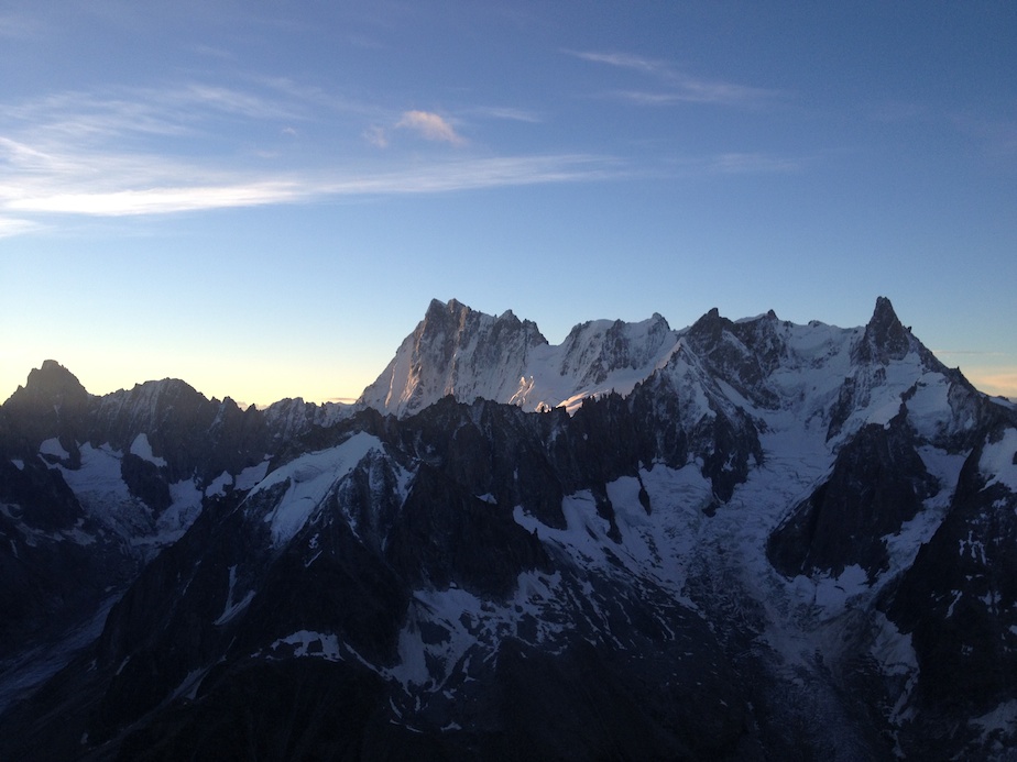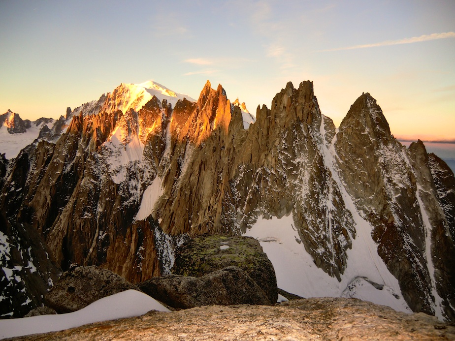 Un bivouac en montagne est toujours un moment magique…s’il est préparé… Etant restés au contact (sonore) d’une cordée toute la journée, nous ne sommes pas étonnés de les trouver au lieu-dit pour la nuit. Sauf que, partis à 4 heures du matin du refuge, ceux-ci avaient prévu de sortir la voie dans la journée, et suite à diverses erreurs, se sont retrouvés bloqués ; pas de couverture de survie, pas de vêtements de rechange, pas de vivres chaudes. Les pieds dans le sac pour éviter les morsures du froid, assis sur leur corde pour les protéger de la neige et de l’humidité, leur nuit s’annonce beaucoup plus dure que la nôtre, équipés de nos chaudes doudounes, duvets, tapis de sol et réchaud. Bien sûr nous partageons avec eux nos ressources mais il nous semble que ce qui leur fait le plus de bien est la possibilité de parler. Isolés à 3 500 mètres sur une plateforme vertigineuse, cernés de glaciers turbulents et mordus par le froid, la solitude qui s’abat sur leur cordée est peut être le plus dur à supporter. De notre côté le bivouac est tout autre : bien préparé, il nous permet de profiter pleinement de cette parenthèse magique en altitude, au plus prêt de la montagne, émerveillés par les jeux de lumière qui animent le Mont Blanc et les Aiguilles de Chamonix.