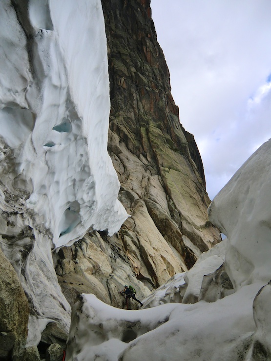 Du coup on a pris notre temps. Parce que dormir là-haut cela veut dire transporter son duvet et son matériel de bivouac sur plus de 1’500 mètres de dénivelée dont 800 mètres d’escalade et le passage d’une rimaye bien ouverte et difficile à négocier.