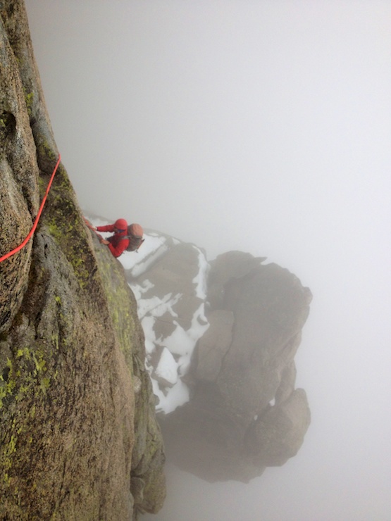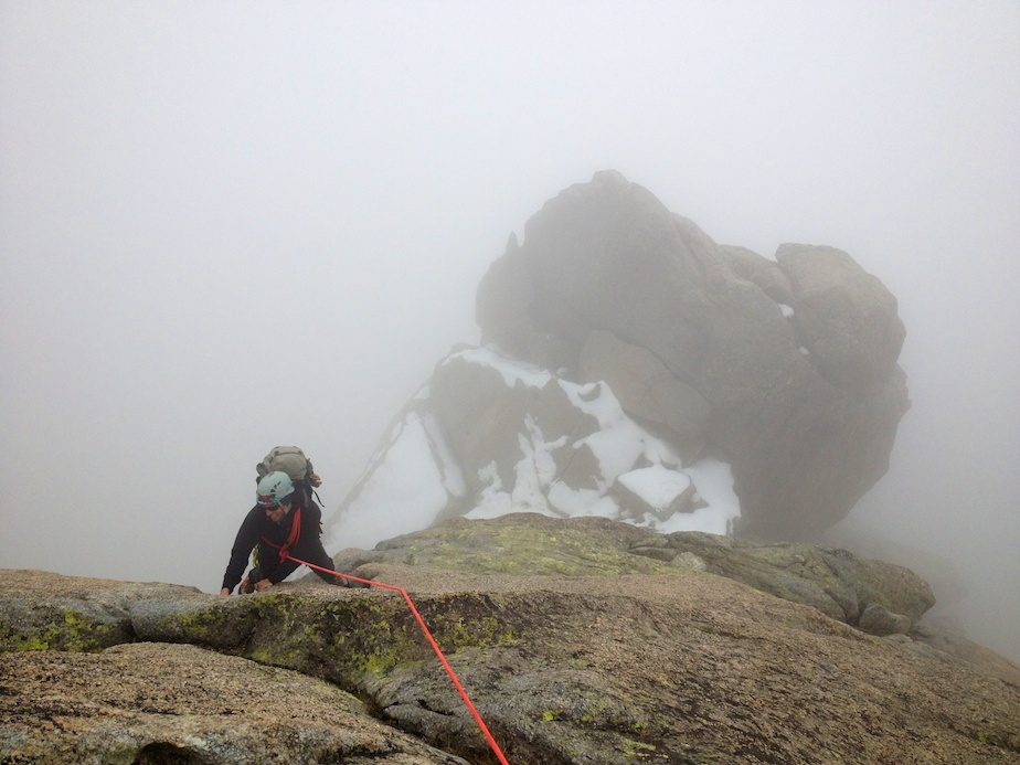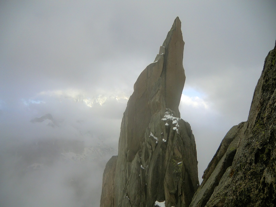 Partis très tard du refuge, assommés par une plâtrée de polenta la veille, initialement prévue pour trois, que même cinq estomacs montagnards n’ont pas réussi à épuiser, nous sommes logiquement arrivés de nuit à la brèche située 20 mètres sous le sommet. Ayant gravi la majeure partie de la journée enveloppés dans une épaisse brume qui nous a bouché la vue, nous décidons de concert d’aller chercher des vires de bivouac 50 mètres sous la brèche sur le versant opposé. La dernière longueur est en effet réputée difficile et il serait dommage de ne pas bénéficier de la vue sommitale. Notre seule inquiétude concerne notre capacité le lendemain à revenir au niveau de la brèche car nous devons tirer deux rappels pour rejoindre nos emplacements pour la nuit.