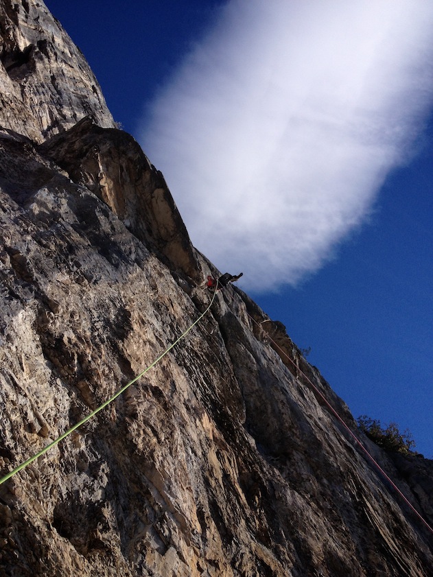 La journée commence avec une certaine émotion puisque l’accès au pied de la falaise se fait par le haut, en rappel, plein gaz. La sortie sera par le haut ou ne sera pas !