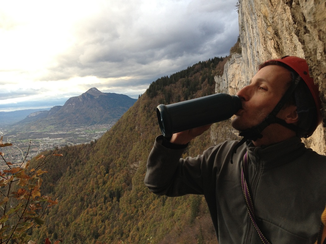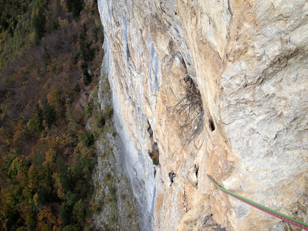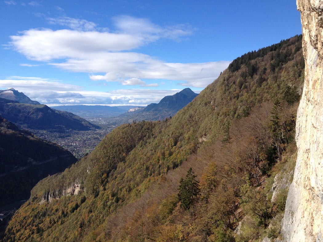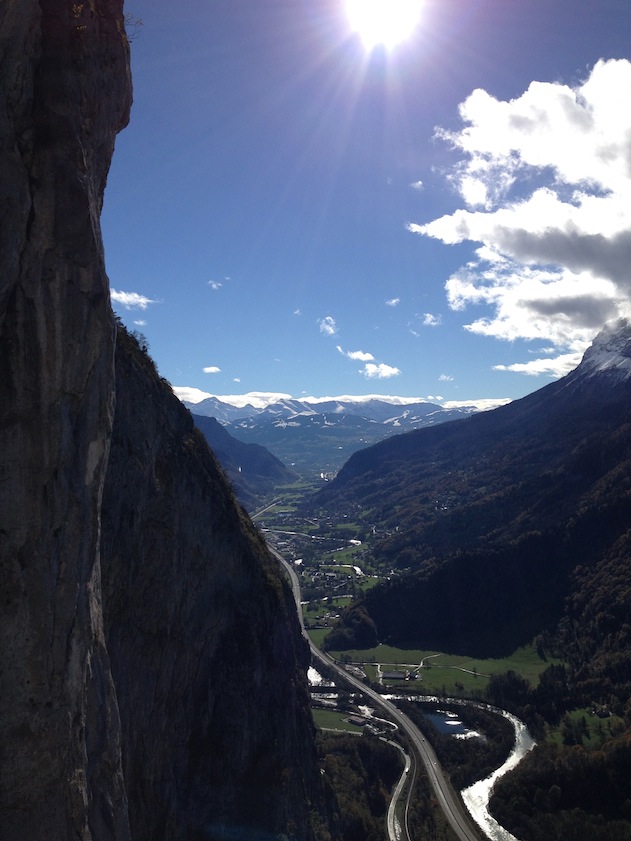Faire une voie qui surplombe l’autoroute blanche a au moins un avantage : chaque fois que je passe par la gare de péage de Cluses, je me dis, « tiens j’ai grimpé cette face » …