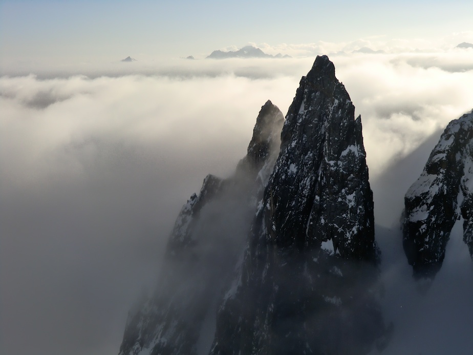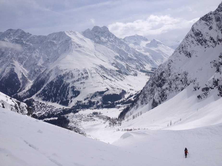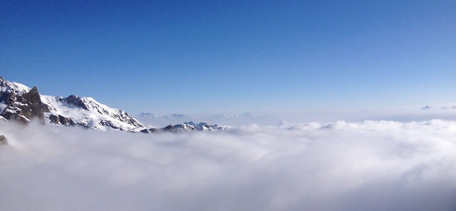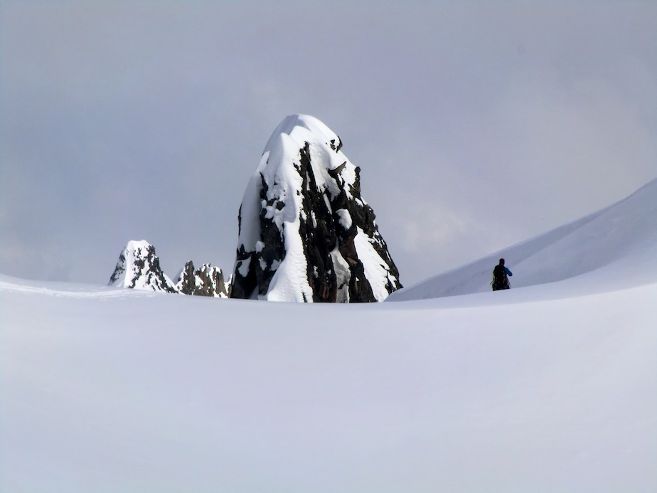 Le lendemain, après une sympathique halte à La Fouly, nous décidons d’occuper notre dernier jour par une montée au Catogne. Voici ce qu’en dit le topo : Un sommet particulier, en effet ce sommet bien visible à l’entrée du val d’Entremont est bien délimité, situé entre 3 vallées il est un sommet et un massif à part entière. Je ne saurais en dire plus car de ce sommet je n’ai rien vu, ou presque. Nous avons fait la montée et la descente quasiment à l’aveugle. Conséquence : erreur d’itinéraire à la montée, nous avons emprunté un couloir d’avalanches ; rebelote à la descente où nous nous sommes retrouvés dans un couloir infâme, impossible à skier… Une belle journée dehors tout de même…