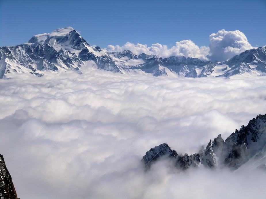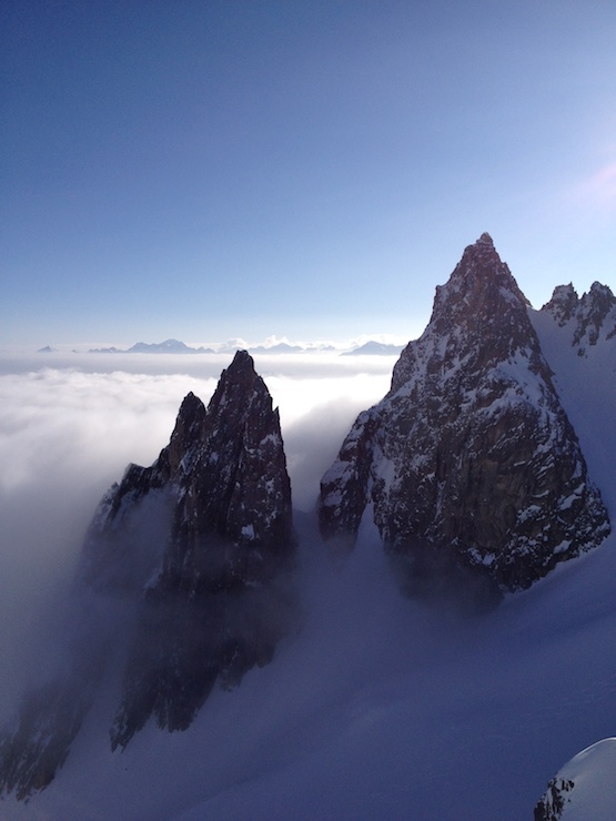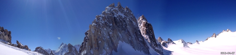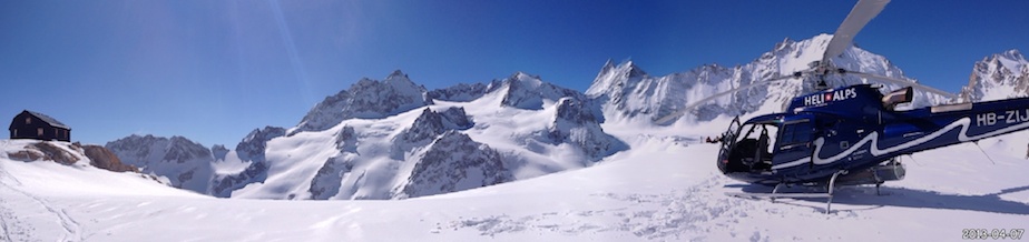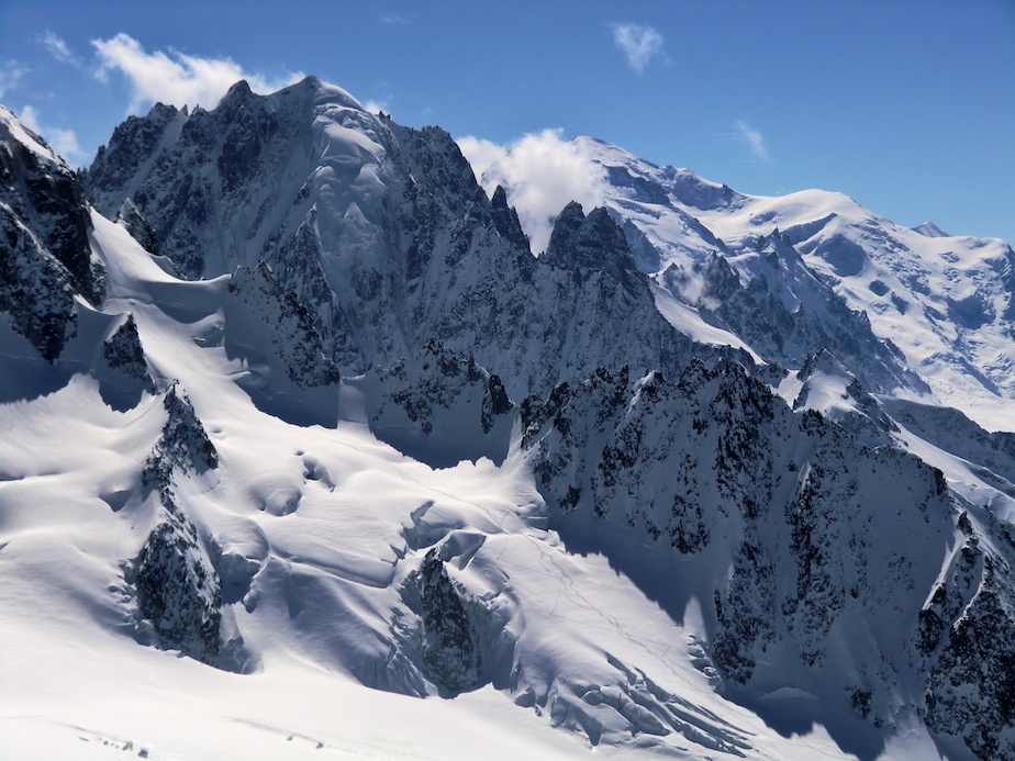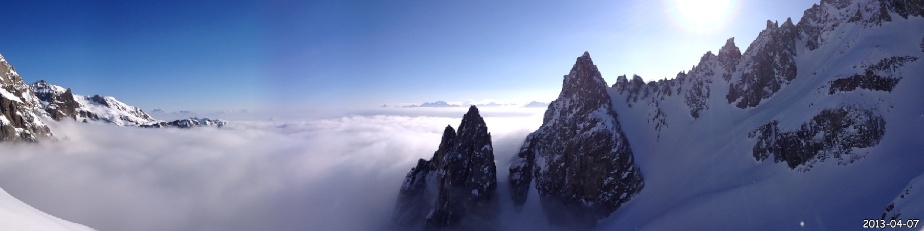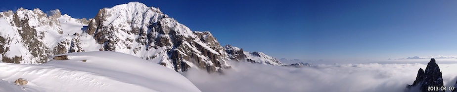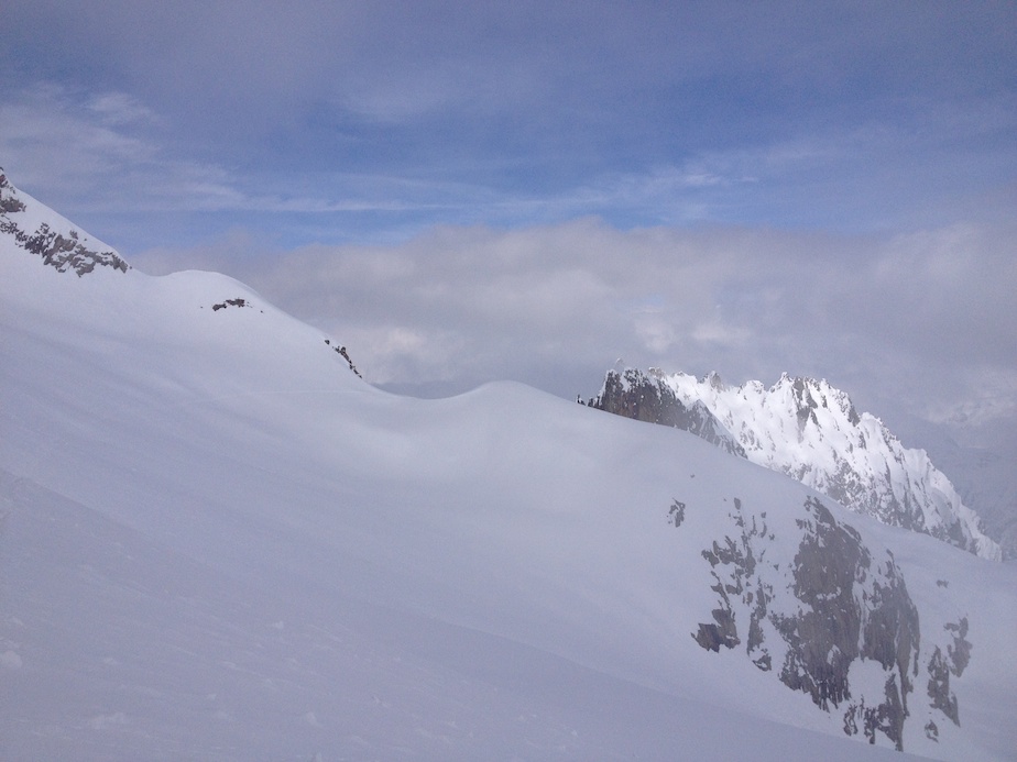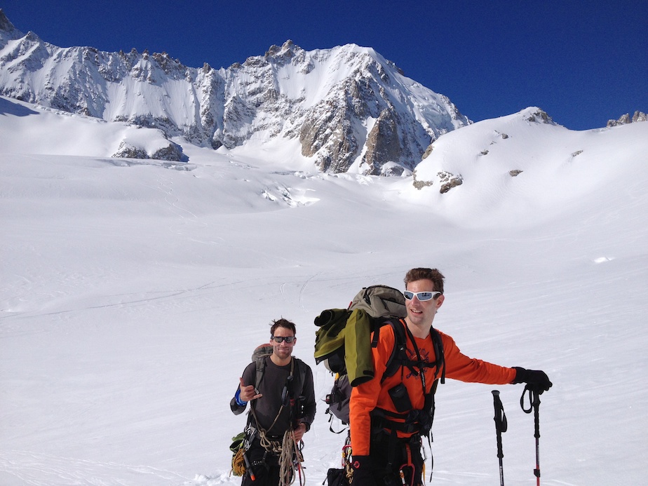 Le lendemain matin, nous descendons sur le glacier de Saleina avant d’entamer notre remontée vers le bivouac de l’Envers des Aiguilles Dorées puis le col sud des Plines (2 995m) d’où nous prenons pied sur le beau plateau de Trient. A cet endroit les itinéraires des 3 et 5 cols se touchent en un point. Alors que notre randonnée doit nous mener directement au col des Ecandies, nous faisons un petit détour par un col proche de l’Aiguille du Tour afin de s’offrir une belle descente de plus et en prime une splendide vue sur le massif du Mont Blanc.