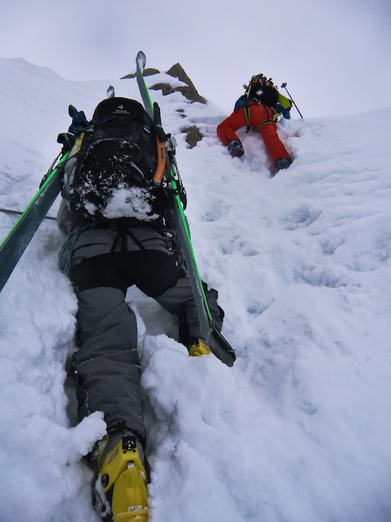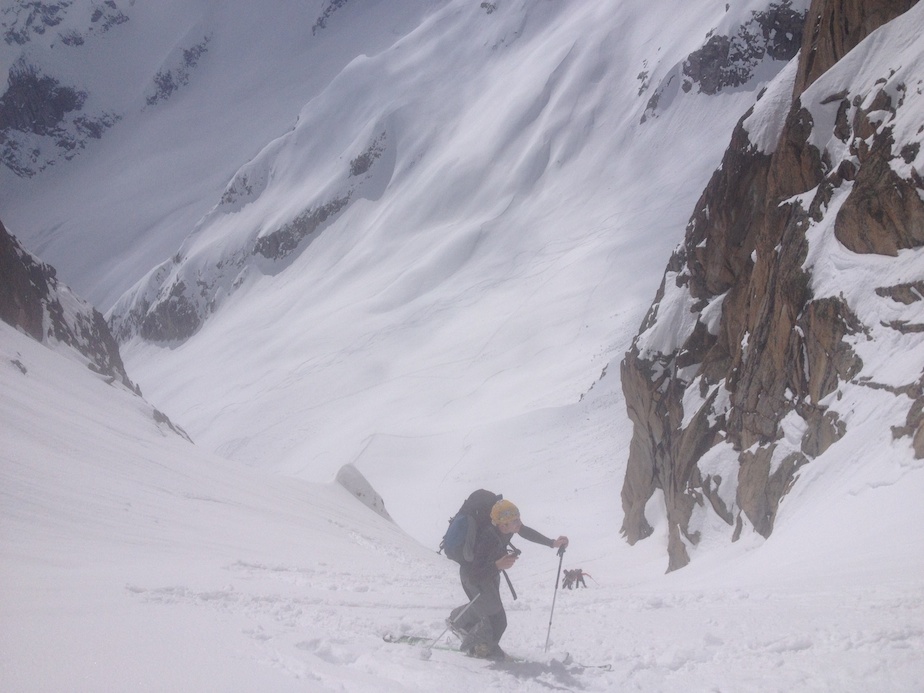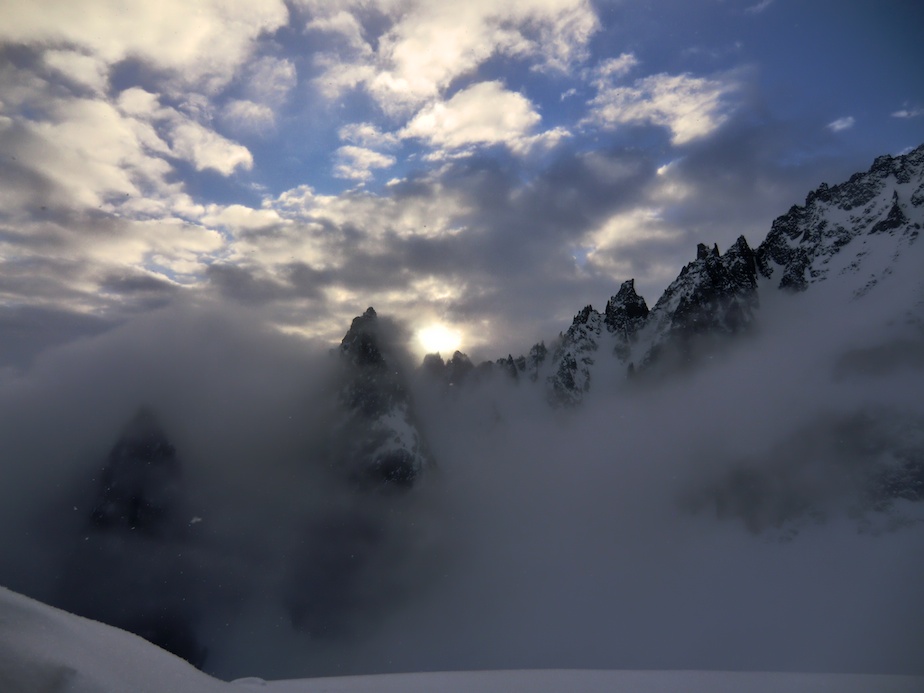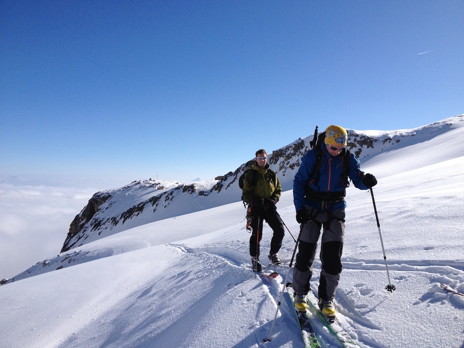 L’itinéraire cumule environ 2 500 mètres de dénivelée sur deux jours dans un fantastique cadre de haute montagne, toujours en Suisse avec quelques pas sur la frontière franco-suisse. Le premier jour nous partons de La Fouly, dernier village du Val Ferret à 1 600 mètres d’altitude, pour monter en direction de la cabane de l’A Neuve d’où nous franchissons nos trois premiers cols : le col des Essettes (3 108m) que l’on atteint par un couloir relativement raide sans que nous ayons toutefois à retirer nos skis, puis par une traversée quasiment plate le col supérieur de Crête Sèche (3 024m). Première belle descente de la journée dans une bonne poudreuse pour rejoindre le bas du col des Planereuses (3 030m) où nous devons lutter pour trouver des points d’appuis dans une poudreuse délicate. Au sommet c’est un épais rideau de brume qui nous accueille et nous n’arrivons qu’à la cabane de Saleina, notre refuge pour la nuit, que grâce à notre GPS.