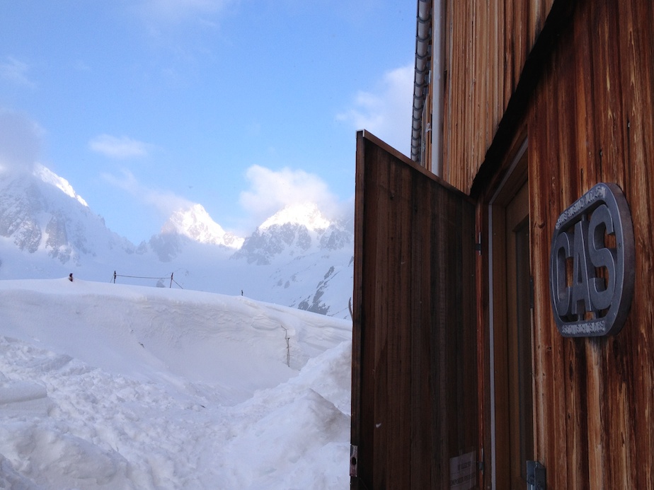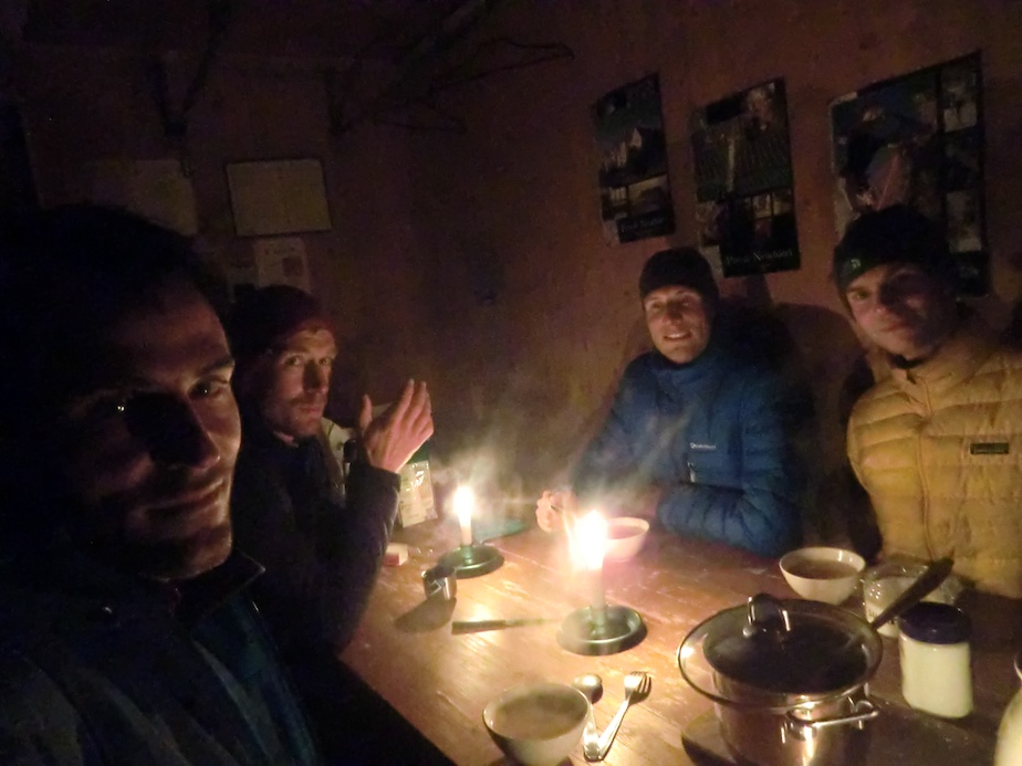 Probablement refroidis par une météo hasardeuse et par le fait que le refuge n’est pas gardienné, aucun skieur n’est monté à la cabane ce soir. Nous serons donc seuls 😉 Réchauffer notre hospice n’est pas de tout repos d’autant que le fourneau est mal conçu et ne dispense sa chaleur qu’avec parcimonie. Qu’à cela ne tienne notre joie d’être là haut compense largement.